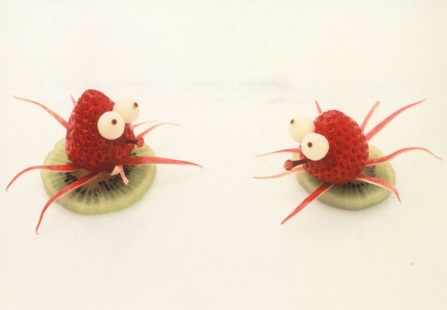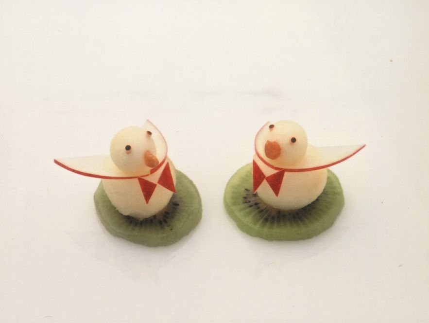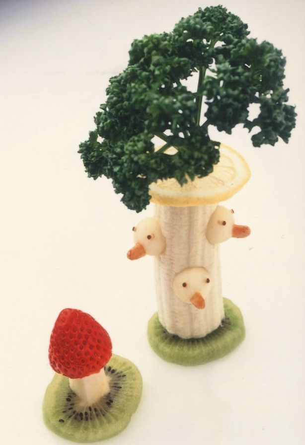 キウイ、バナナ、りんご、レモン、乾めん、いちご、パセリ、柿の種で作成しました。