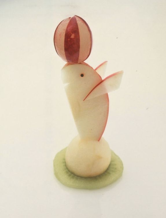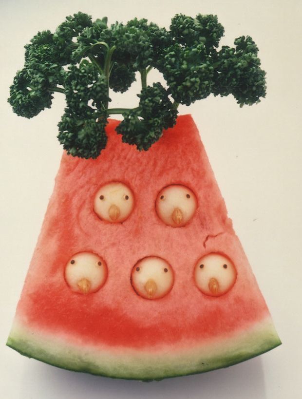 スイカ、りんご、柿の種、乾めん、パセリで作成しました。