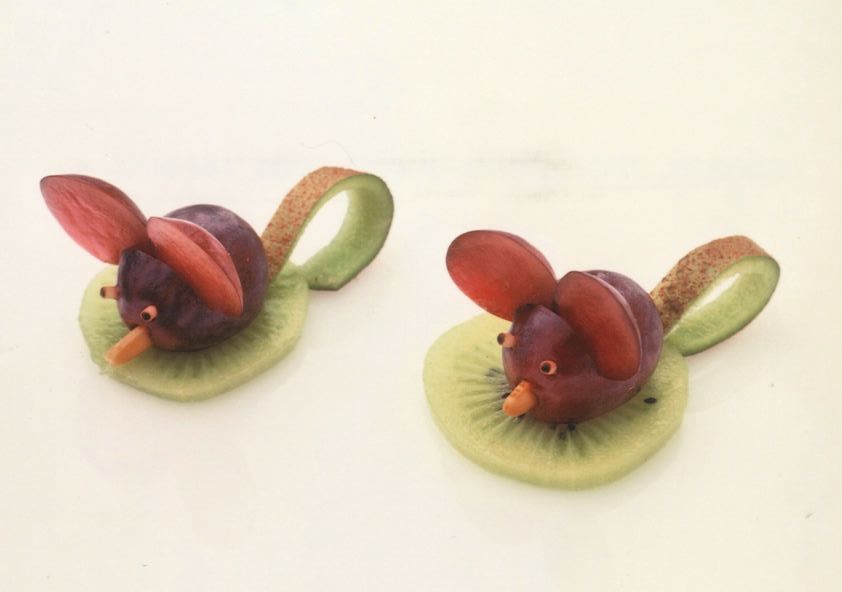 キウイ、ぶどう、乾めん、柿の種で作成しました。
