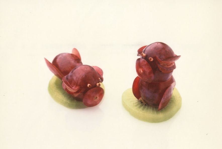 ぶどう、キウイ、りんご、乾めんで作成しました。。